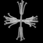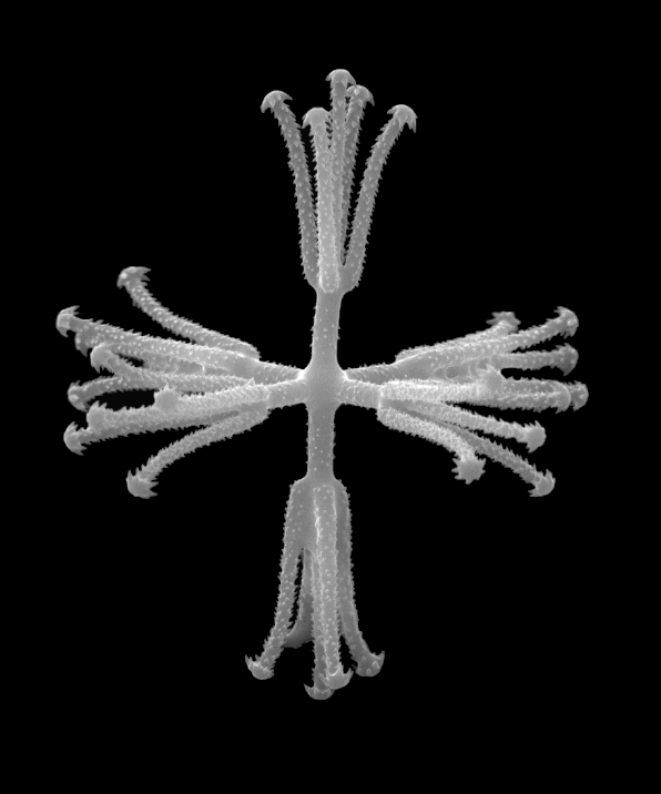 In H.; an oxyoidal hexaster with sigmoidal secondary rays situated on the edge of the discoidal outer end of the primary ray (e.g., Chaunangium crater); p. with snake‐like secondary rays emanating from the edge of a shield‐like disc in a single whorl of primary rays is called aspidoplumicome (e.g., Saccocalyx careyi); see strobiloplumicome.